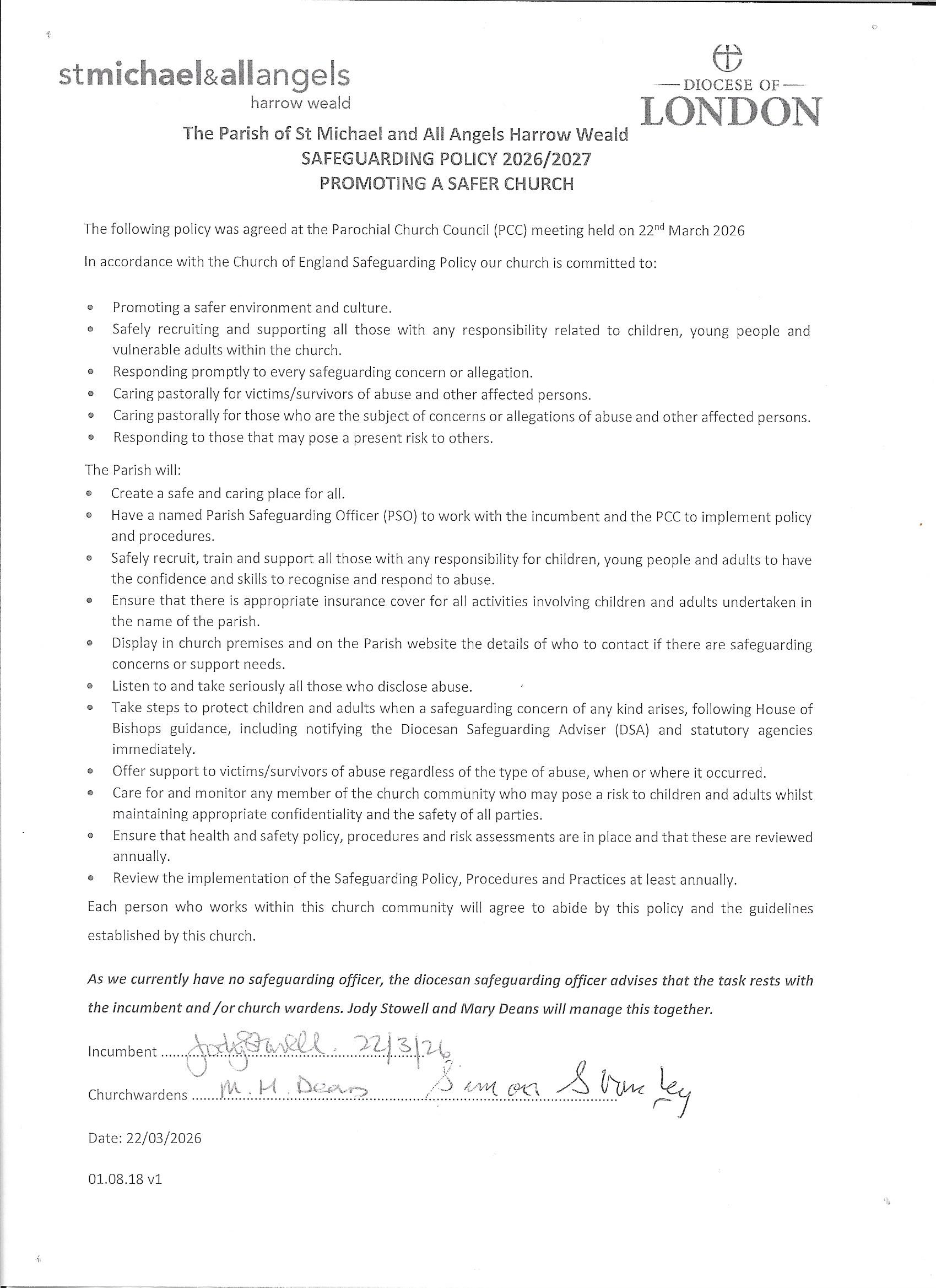 [in the absence of a volunteer to act as Parish Safeguarding Officer, the Diocesan Safeguarding Advisor stated that this responsibility lies with the Vicar/Church Wardens, this was agreed by the PCC]